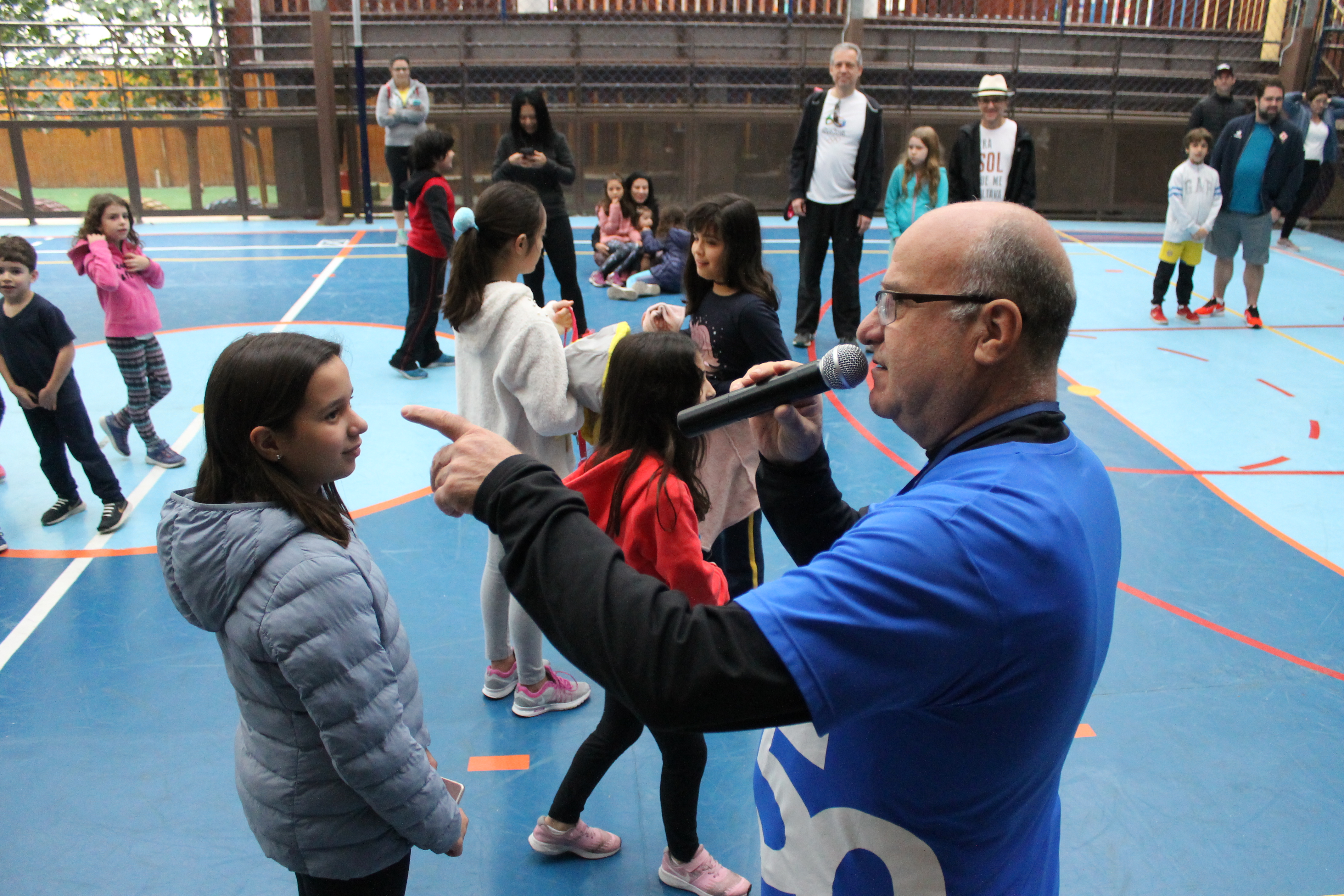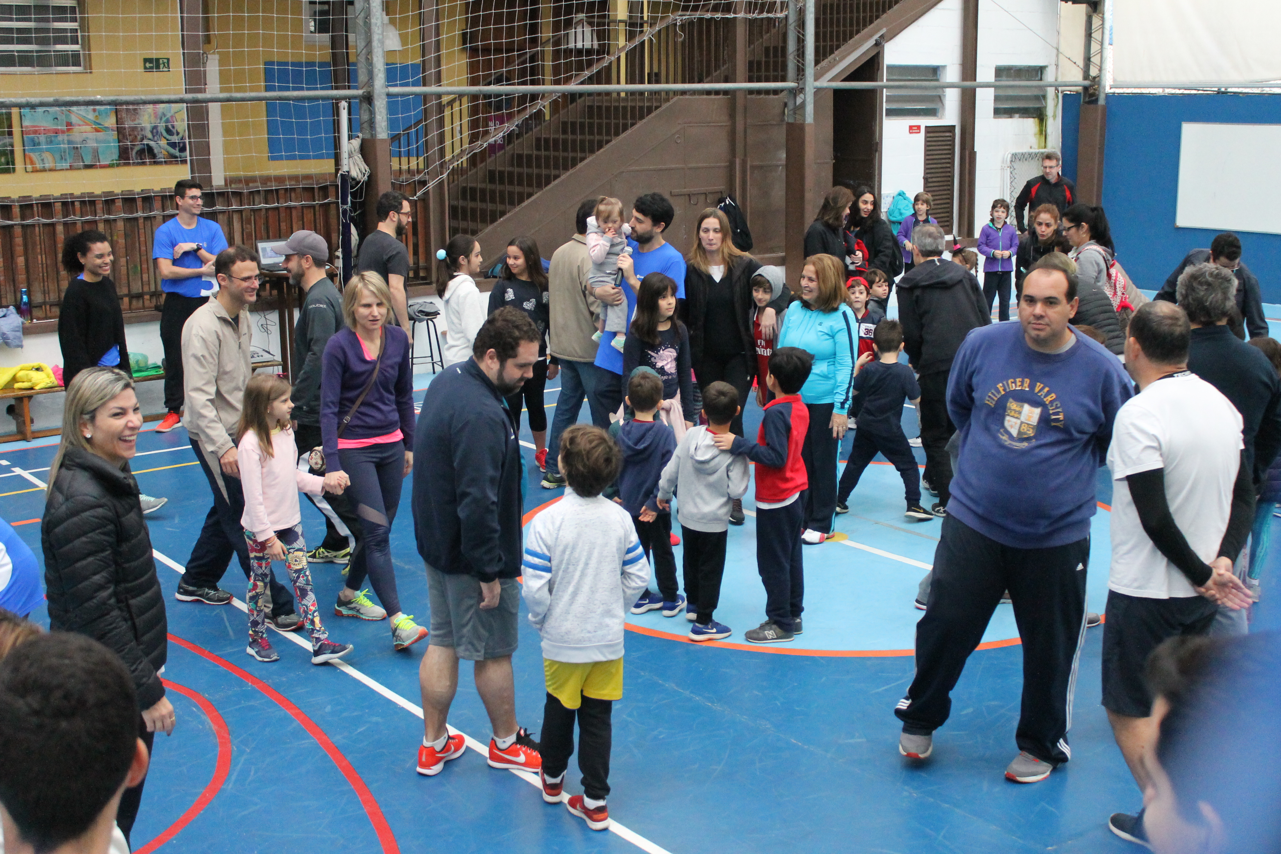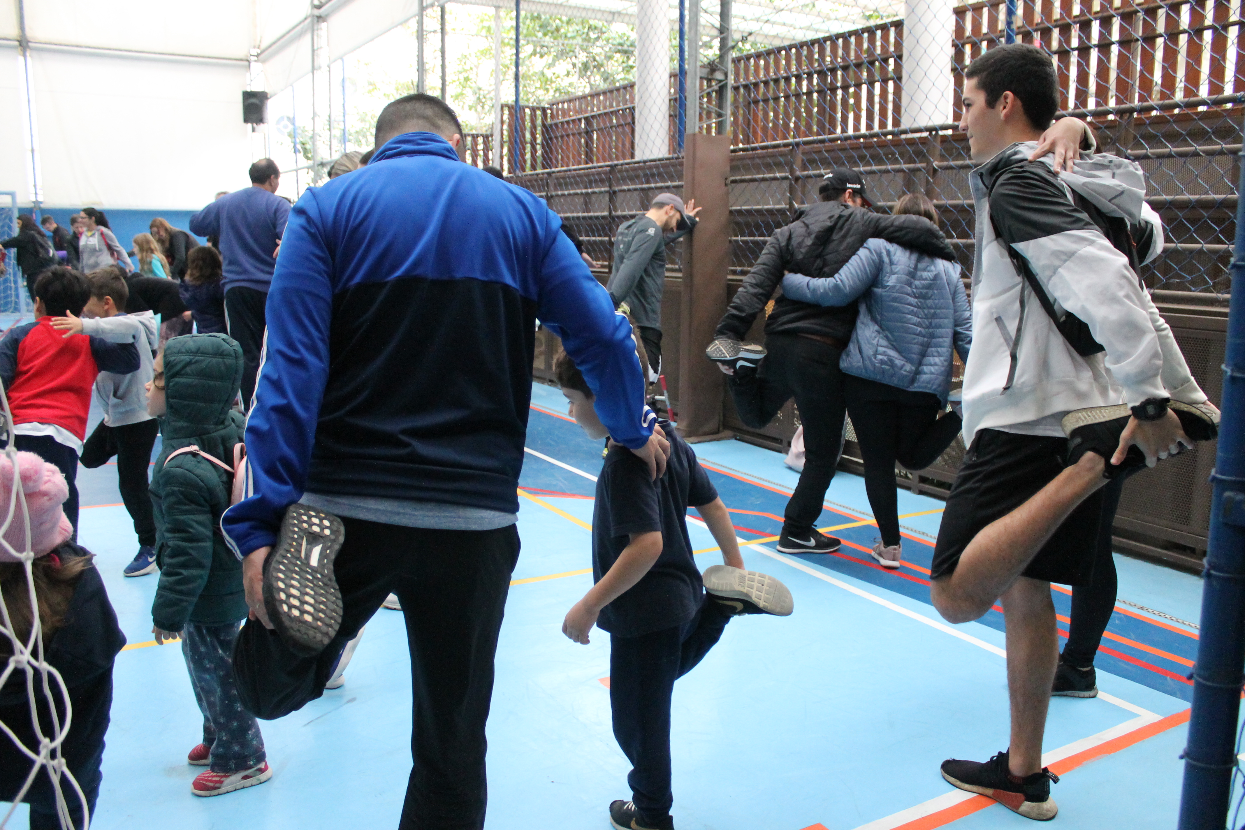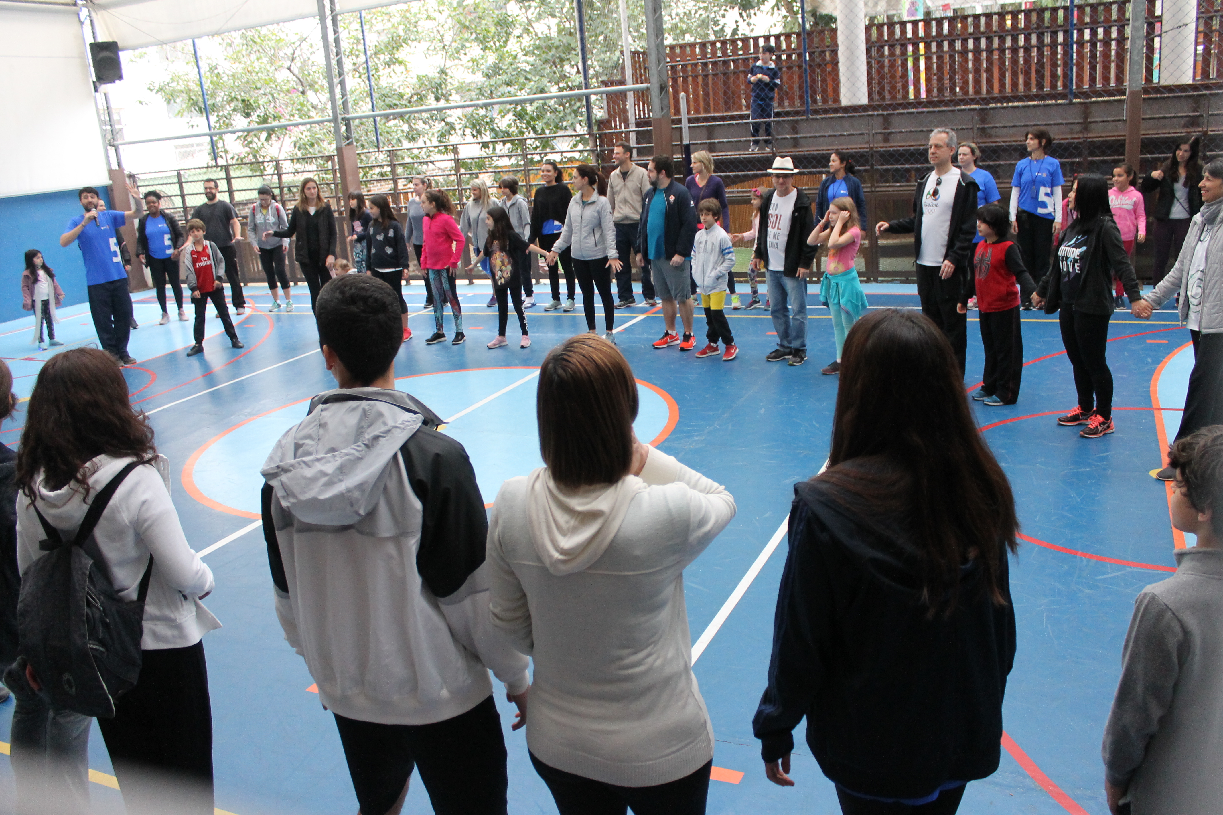 Com toda a comunidade reunida, começamos o evento com um aquecimento coletivo na quadra da Escola. Um momento de integração entre todos que estavam participando desta celebração.