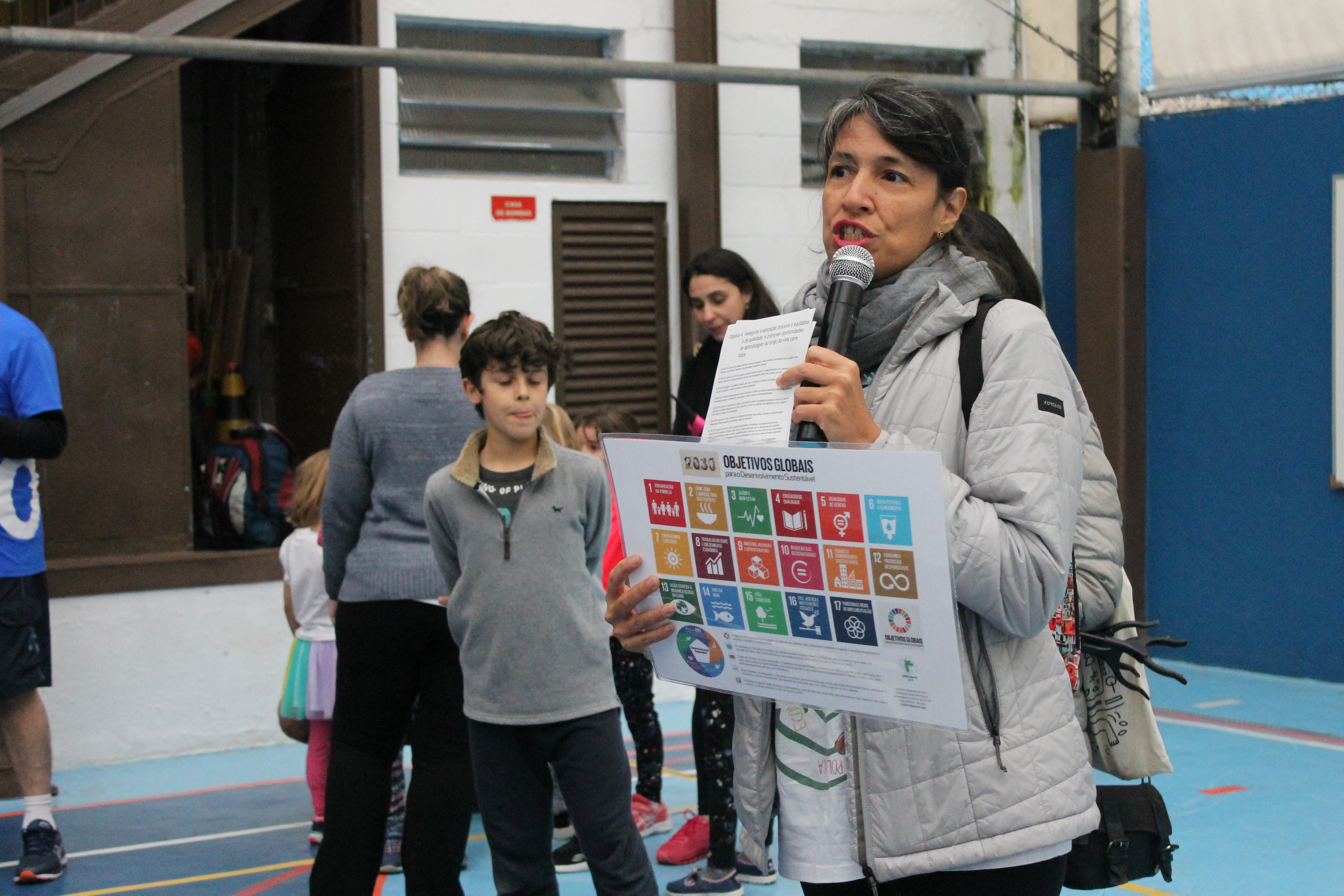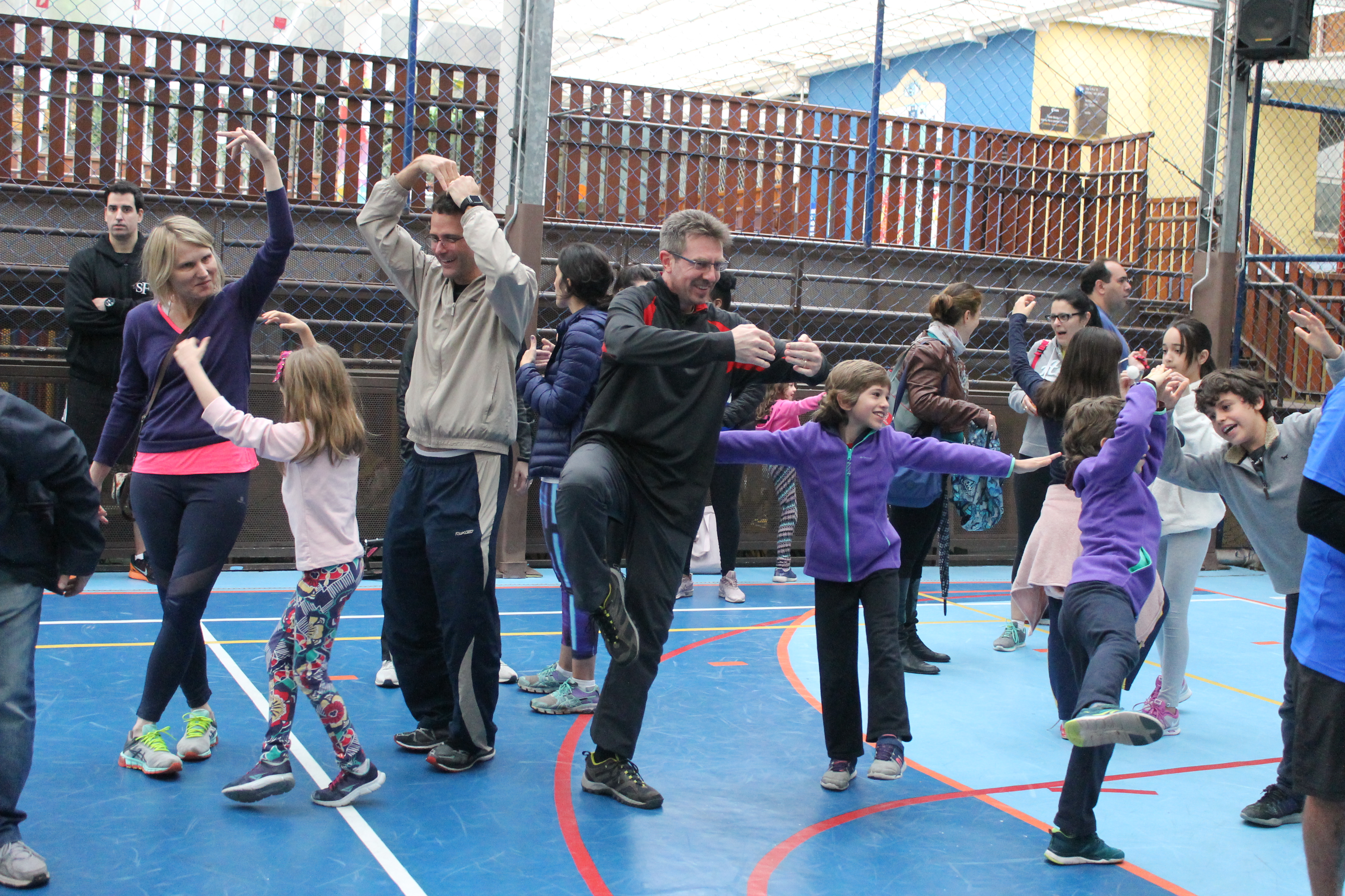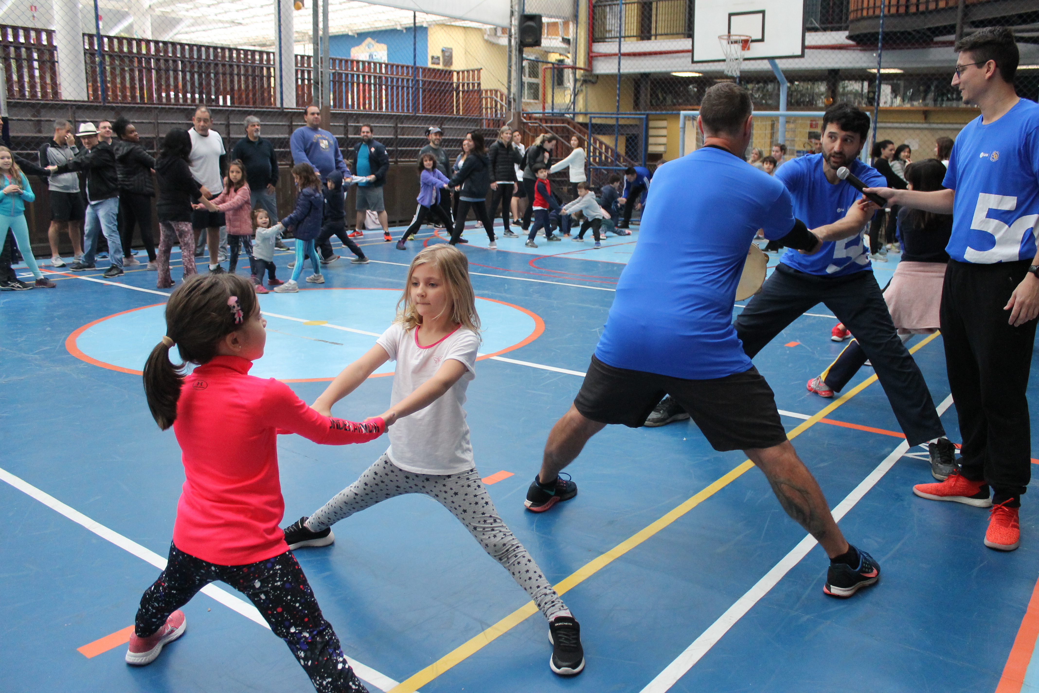 Com toda a comunidade reunida, começamos o evento com um aquecimento coletivo na quadra da Escola. Um momento de integração entre todos que estavam participando desta celebração.