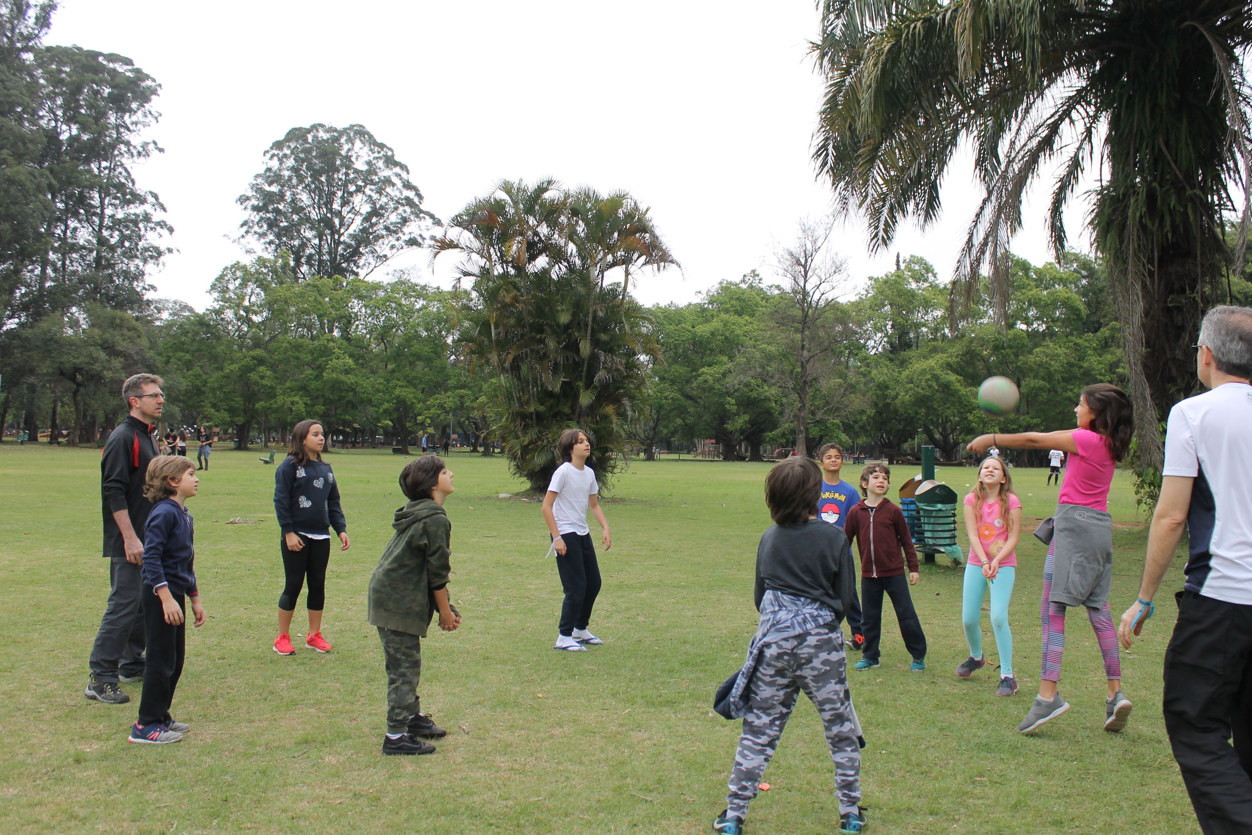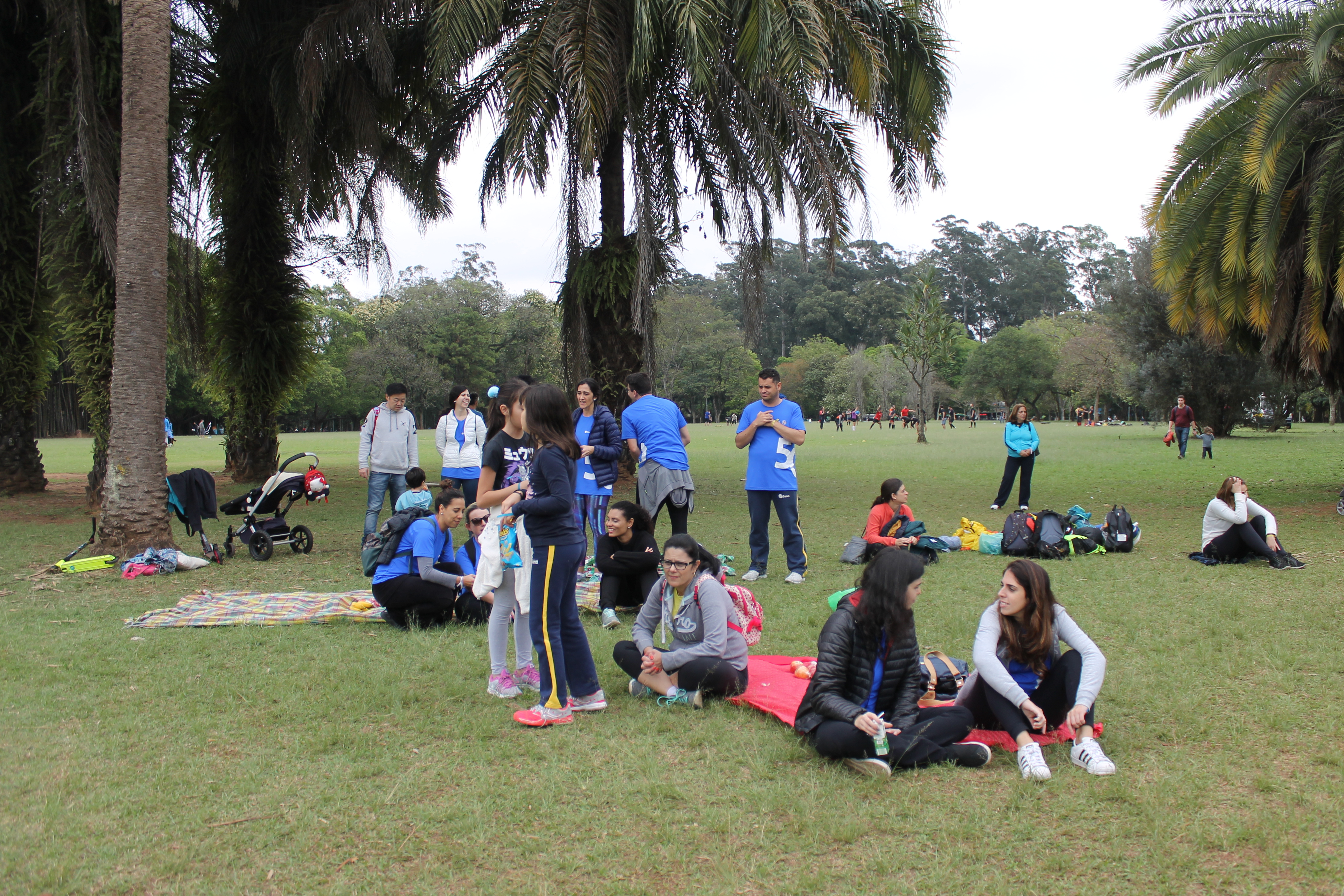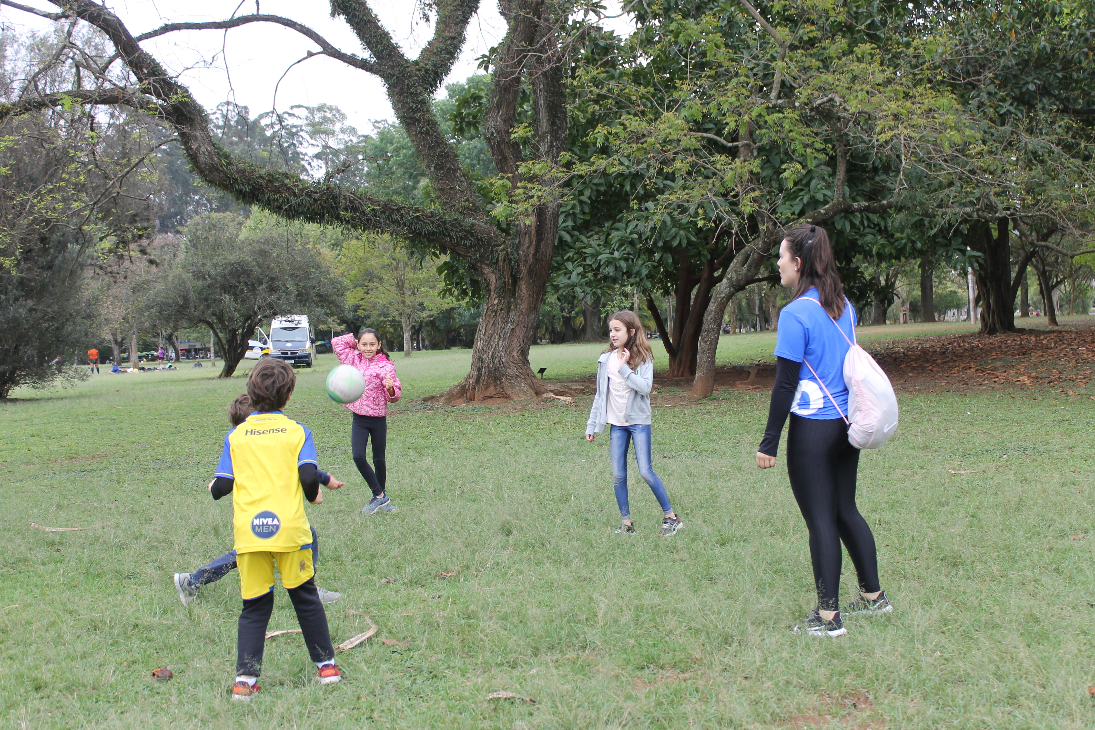 Após 2km de caminhada, chegamos ao nosso destino, a Praça da Paz, um ambiente amplo e verde, onde crianças e adultos de dividiram em diferentes atividades ao ar livre. Entre as opções havia corda, corrida de 3k, taco, corrida de saco e o famoso vôlei.