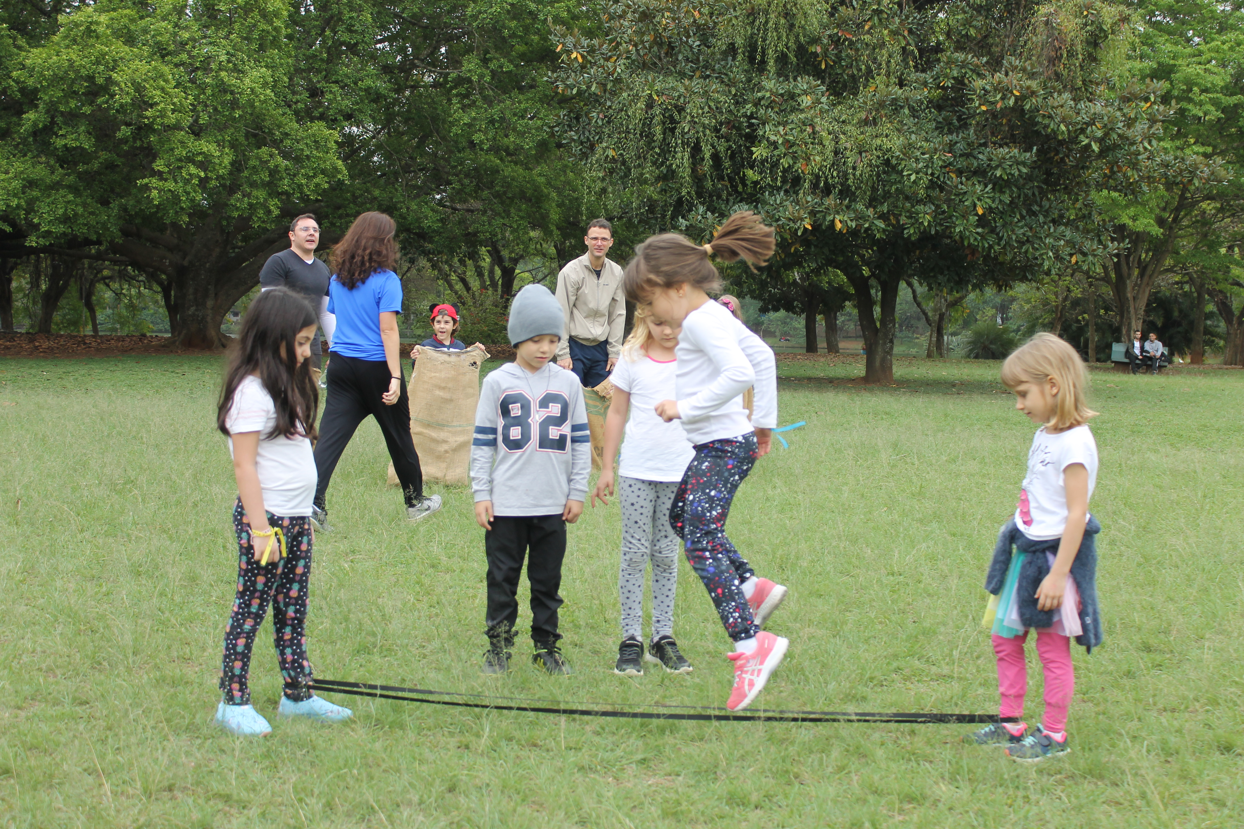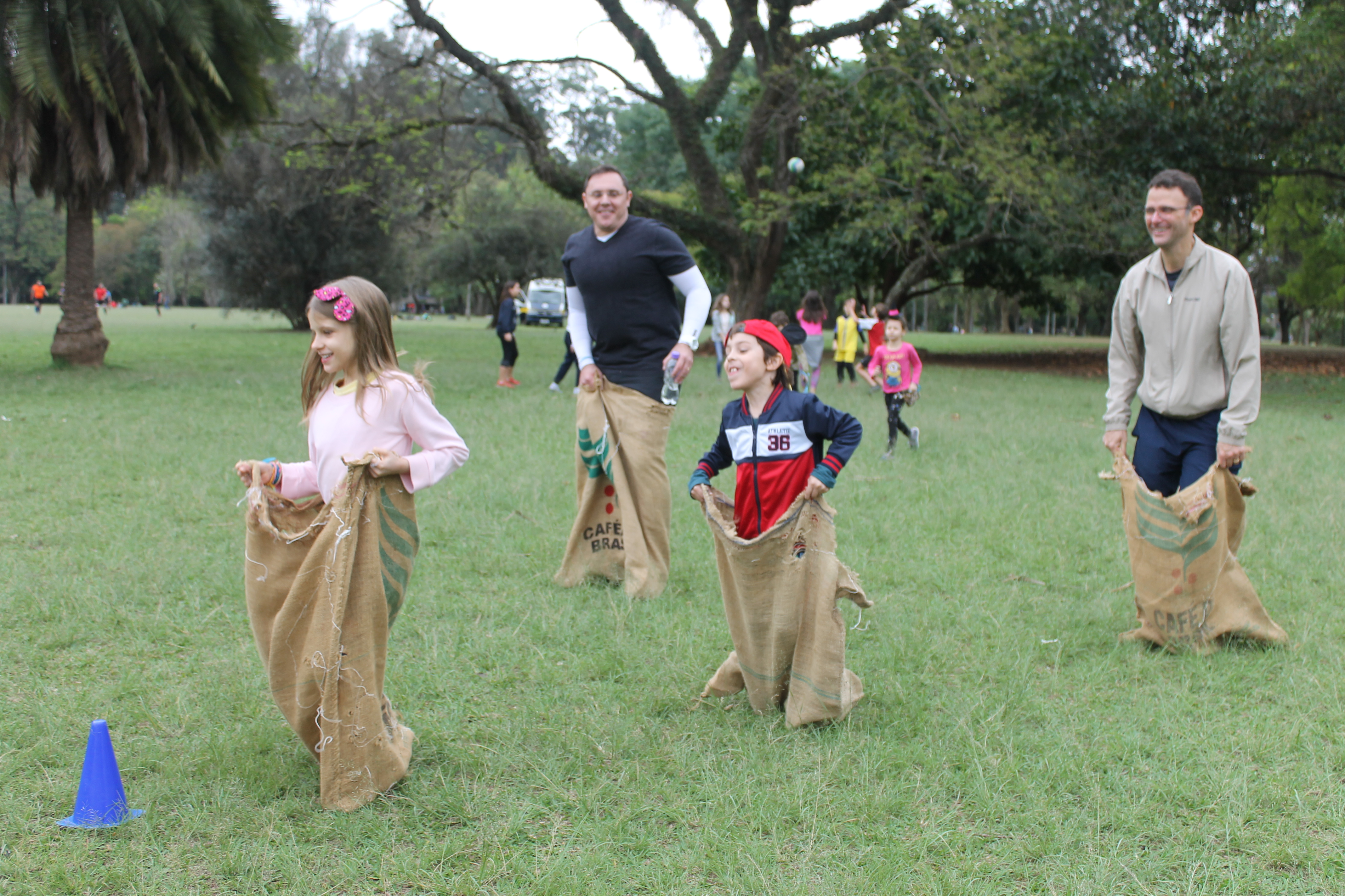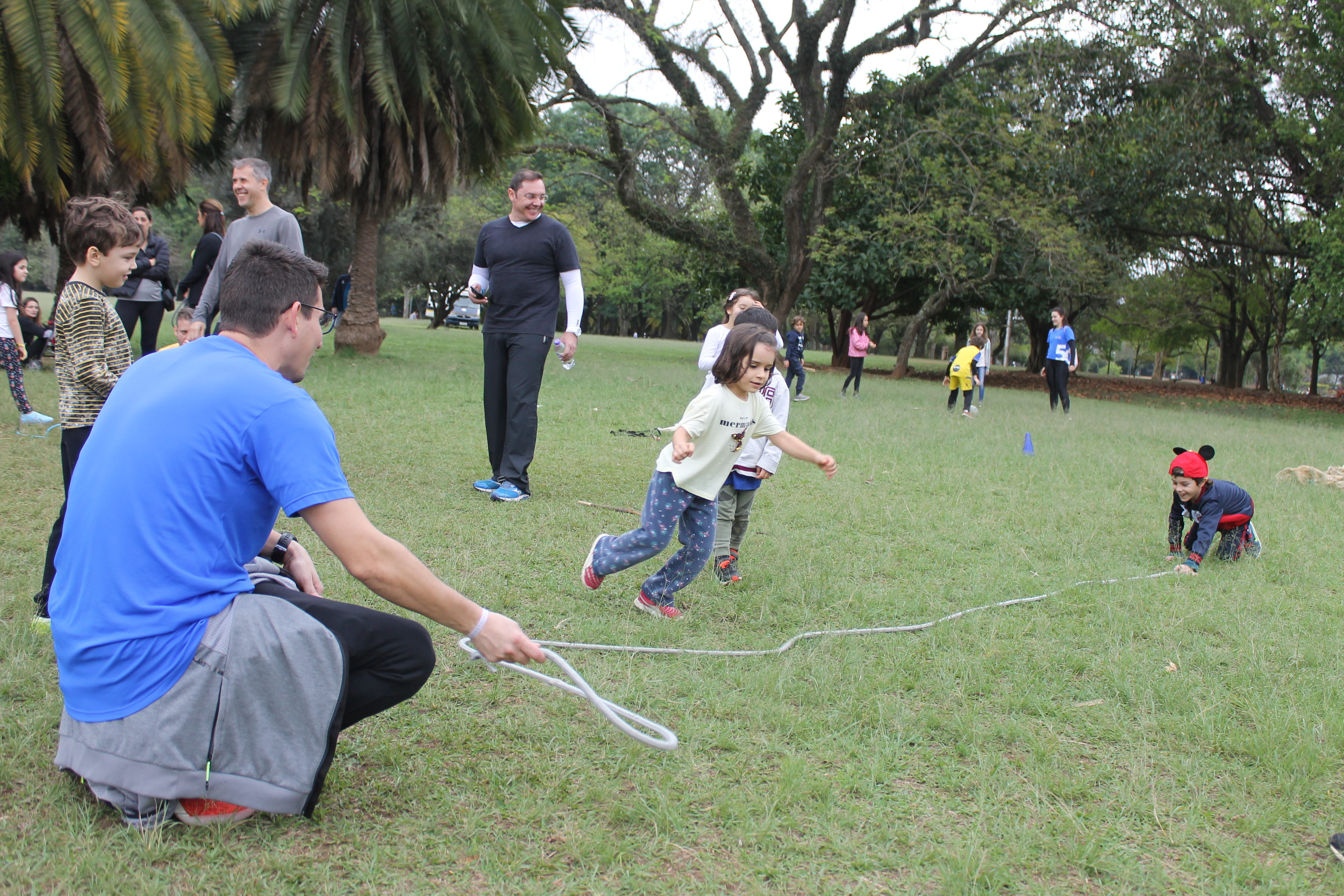 Após 2km de caminhada, chegamos ao nosso destino, a Praça da Paz, um ambiente amplo e verde, onde crianças e adultos de dividiram em diferentes atividades ao ar livre. Entre as opções havia corda, corrida de 3k, taco, corrida de saco e o famoso vôlei.