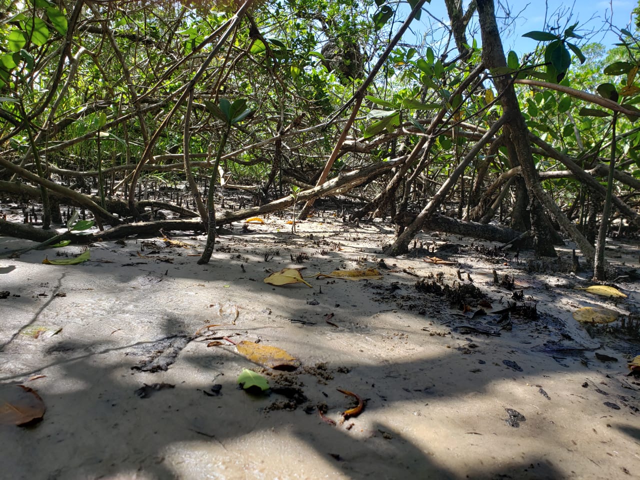 15h – Voltando aos estudos, a turma está na entrada do manguezal fazendo investigações.