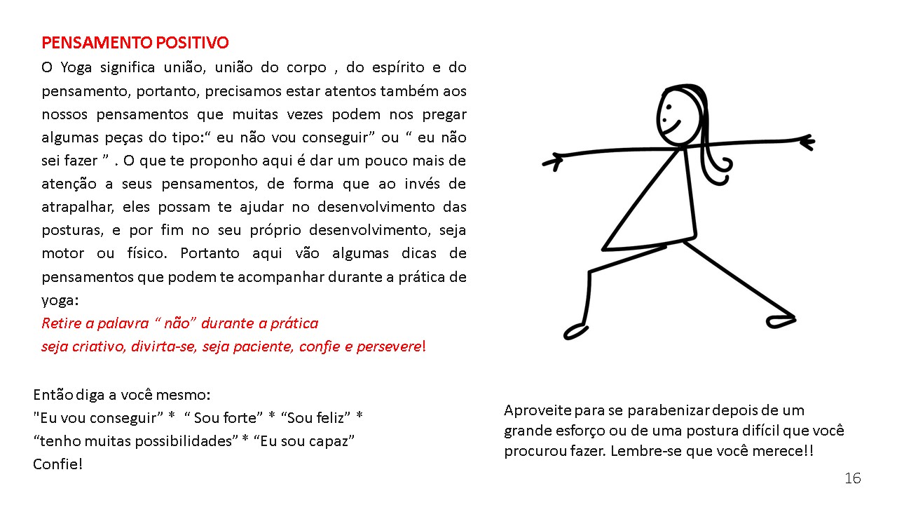 O Yoga significa união, união do corpo , do espírito e do pensamento, portanto, precisamos estar atentos também aos nossos pensamentos que muitas vezes podem nos pregar algumas peças do tipo: “eu não vou conseguir” ou “eu não sei fazer”. O que te proponho aqui é dar um pouco mais de atenção a seus pensamentos, de forma que ao invés de atrapalhar, eles possam te ajudar no desenvolvimento das posturas, e por fim no seu próprio desenvolvimento, seja motor ou físico. Portanto aqui vão algumas dicas de pensamentos que podem te acompanhar durante a prática de yoga: