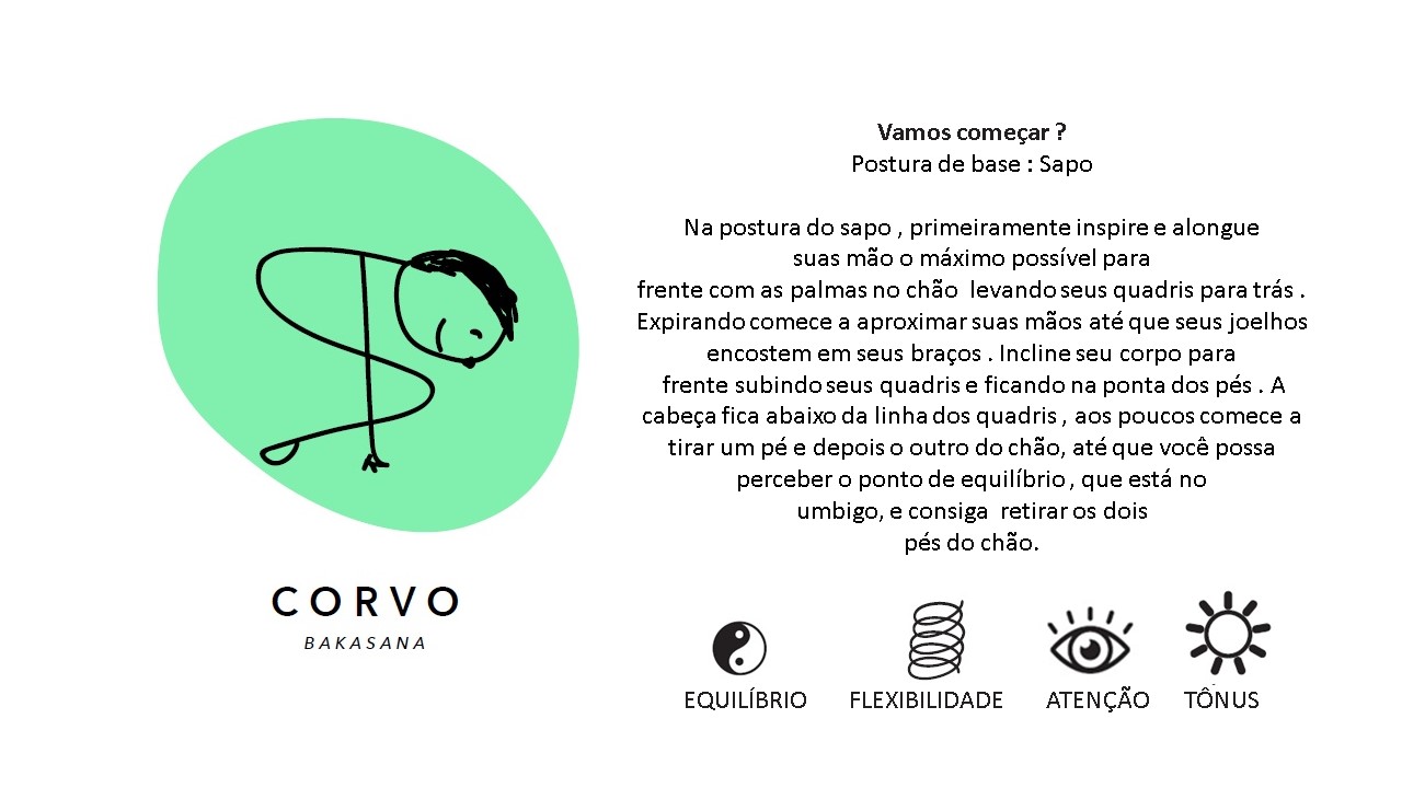 Você já ouviu algum adulto dizer que o medo paralisa? Pois é, quando temos medo de algo, já reparou que ficamos mesmo parados, imobilizados? O benefício da sequência de hoje é simplesmente te fazer perceber que podemos, com cuidado e com cautela avançar, mesmo diante de situações mais difíceis. Para realizar essa postura desafiadora que é a do corvo, é preciso perseverança, calma, deixando de lado o medo de errar. Inspire, expire e divirta-se.