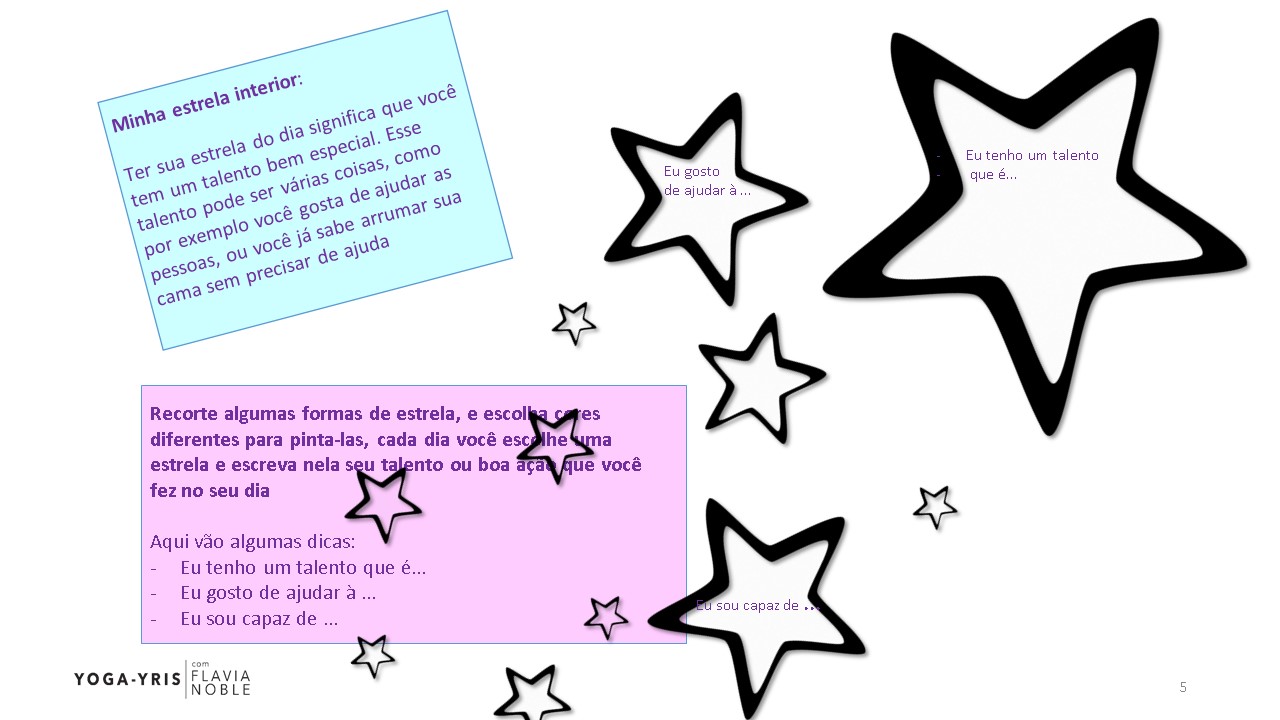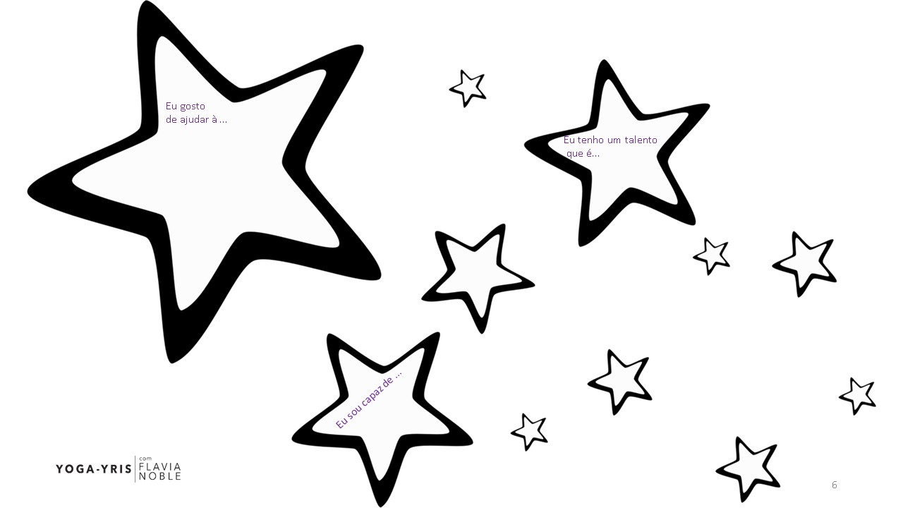 Dessa vez vamos falar de seus talentos, já pensou em alguma coisa que você faz muito bem? Ou será que você é uma pessoa que gosta muito de ajudar os outros, fazendo uma boa ação?Aqui está para você fazer ao longo da semana, uma estrela para cada dia. você escolhe uma estrela, escreve qual é o seu talento do dia, recorte, você pode até pintá-la, e depois fixar na parede, na geladeira, ou colocar dentro de um pote de vidro, que virá a ser o seu pote de talentos.