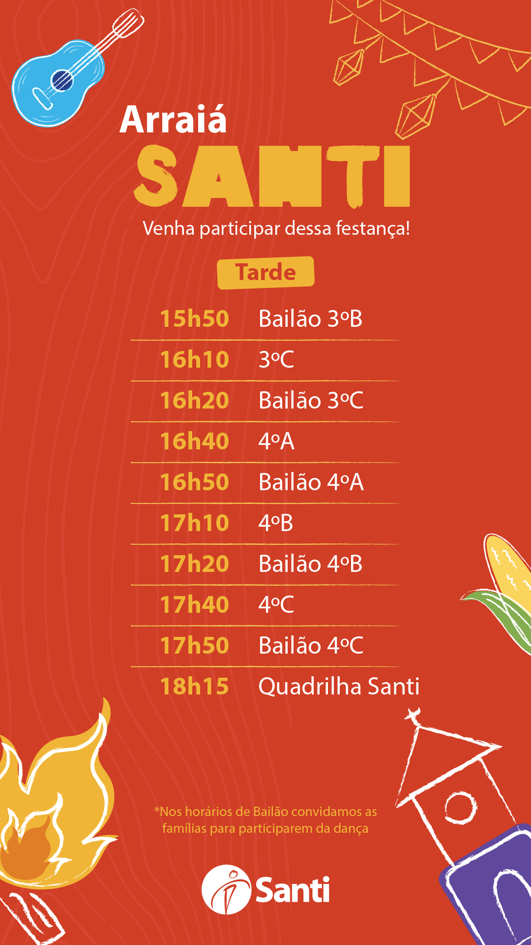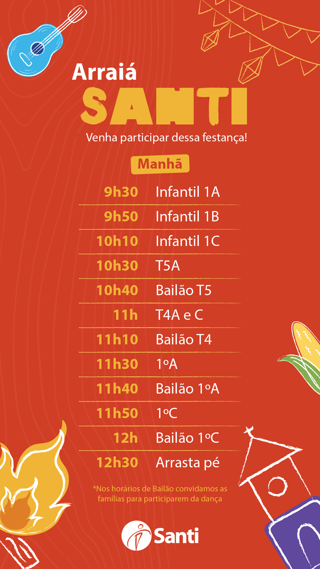 - Apresentação de danças típicas do Infantil 1 ao 5° ano. Ao longo da festa, teremos bailões! Será o espaço para pais e filhos dançarem juntos! Confira aqui o horário da turma do seu(sua) filho(a) no convite.